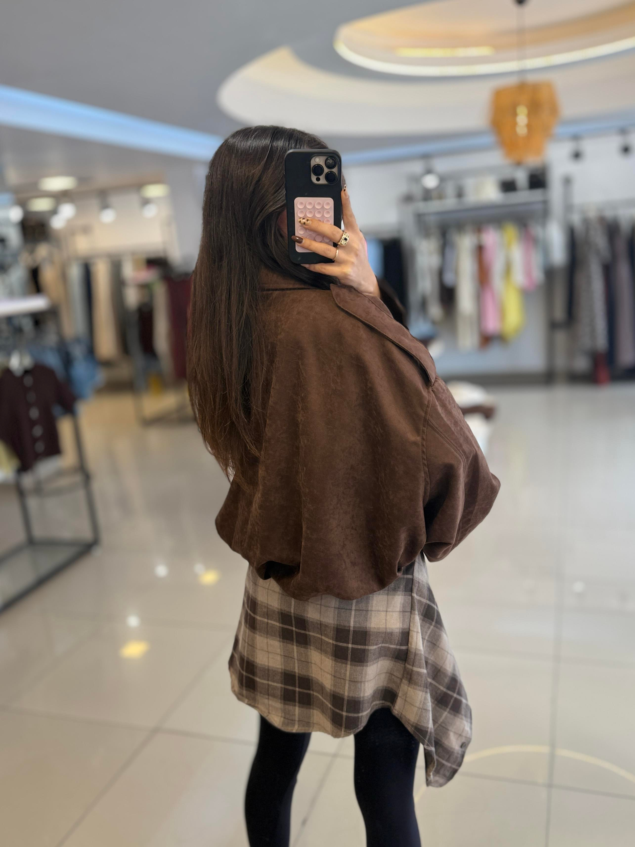ACI KAHVE SÜET FERMUARLI DÜŞÜK OMUZ BOMBER CEKET