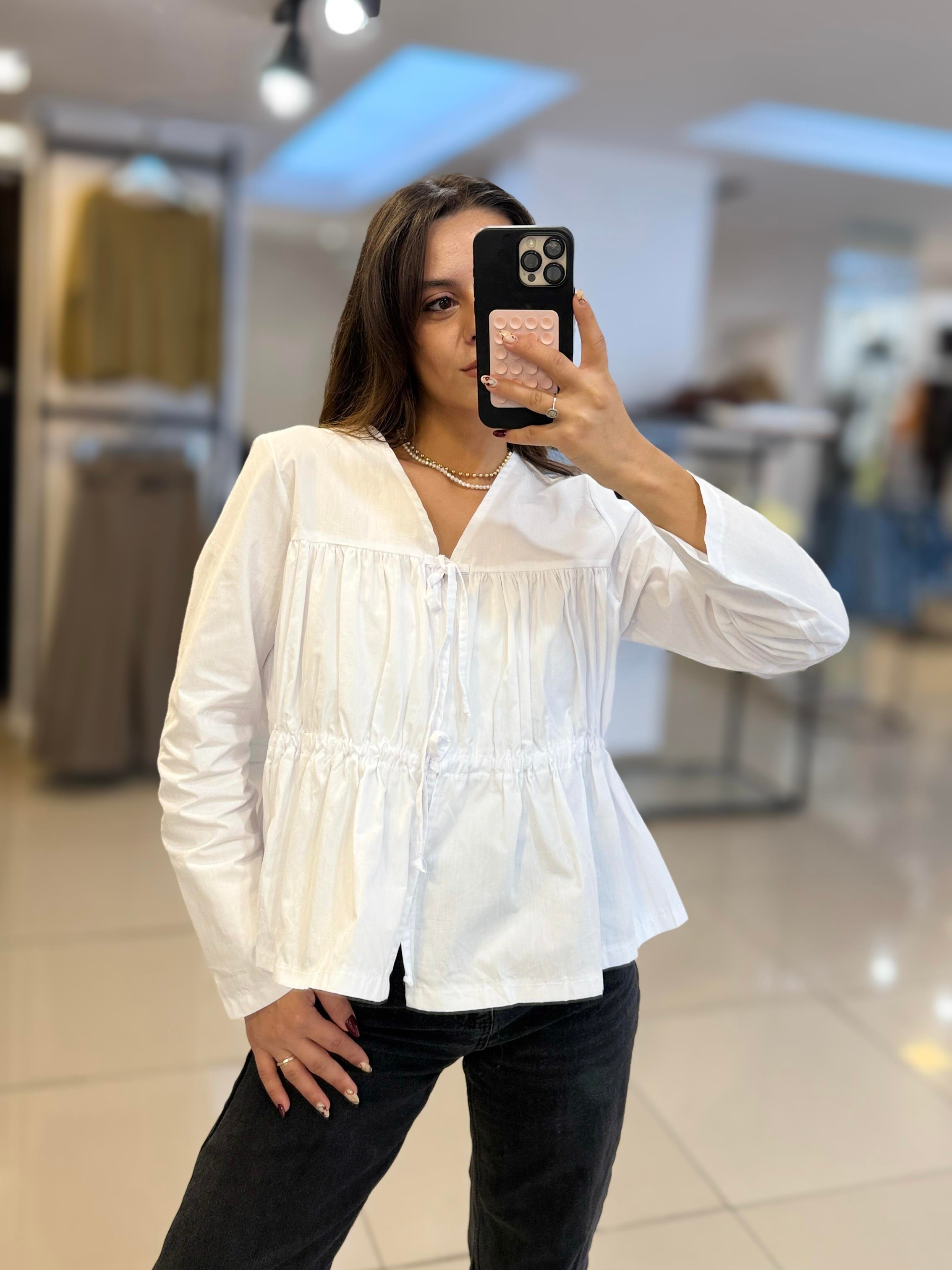 BEYAZ BAĞLAMA DETAYLI BÜZGÜLÜ POPLİN BLUZ