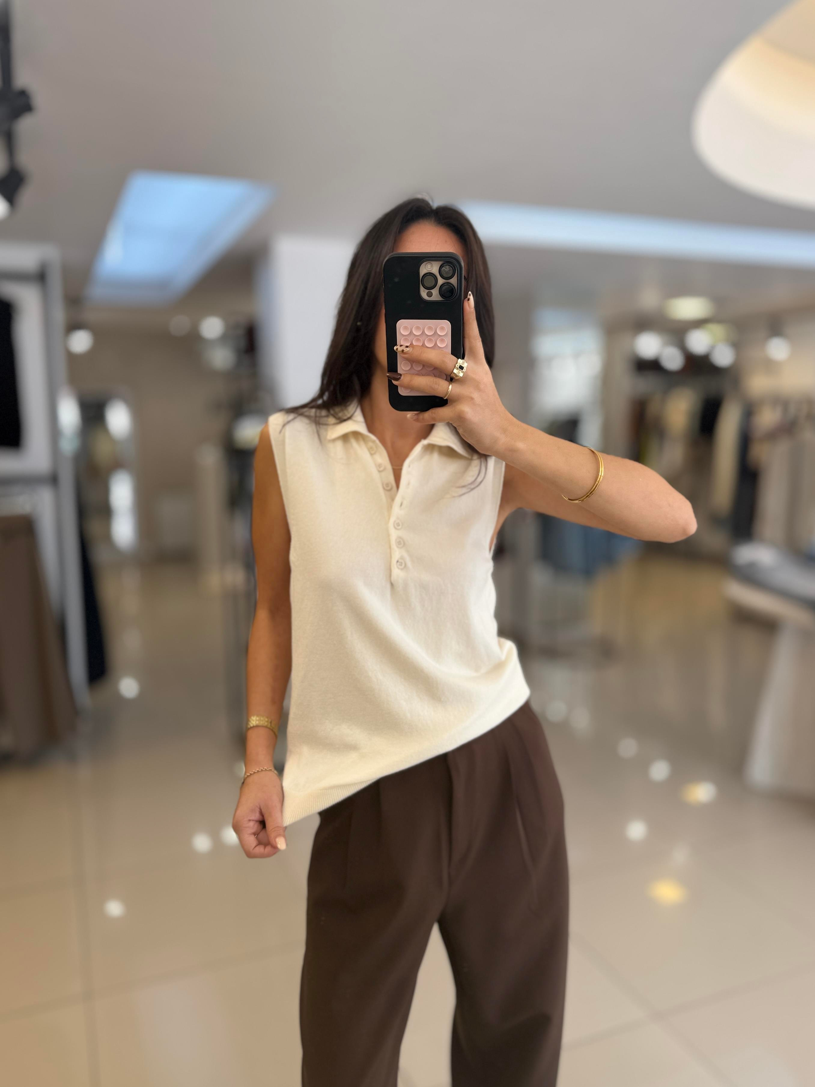 EKRU POLO YAKA DÜĞMELİ SÜVETER
