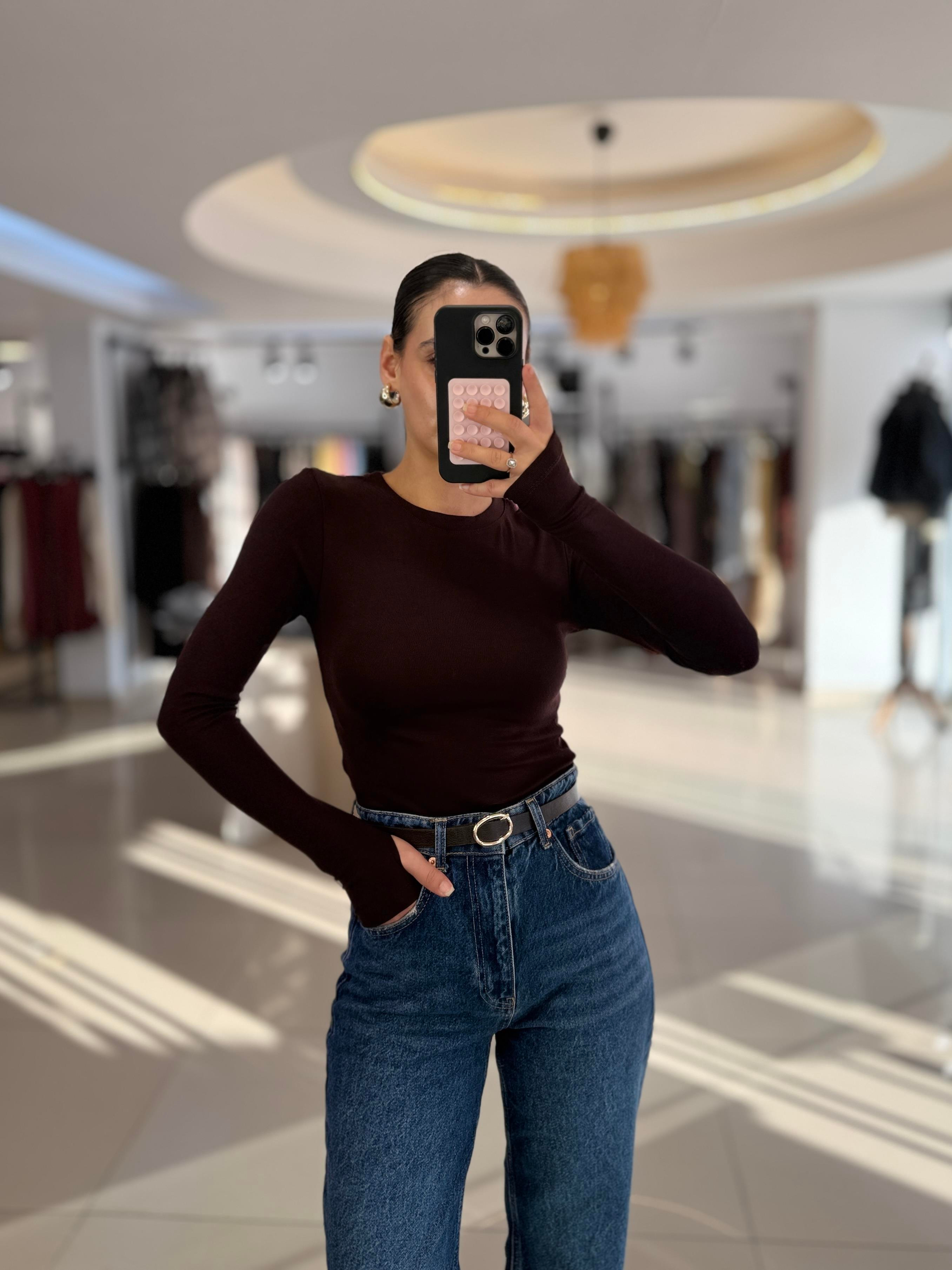 KAHVE BASIC YAKA PARMAK GEÇMELİ BLUZ