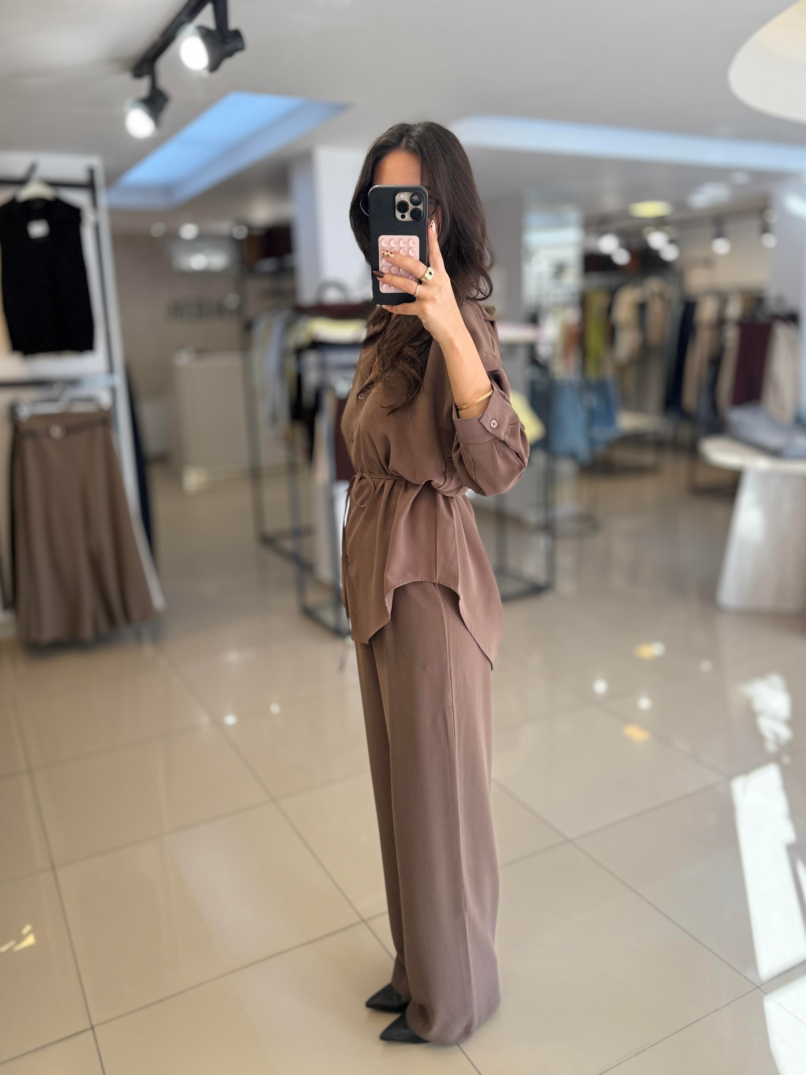 KAHVERENGİ BELİ BAĞLAMALI GÖMLEK PANTOLON TAKIM
