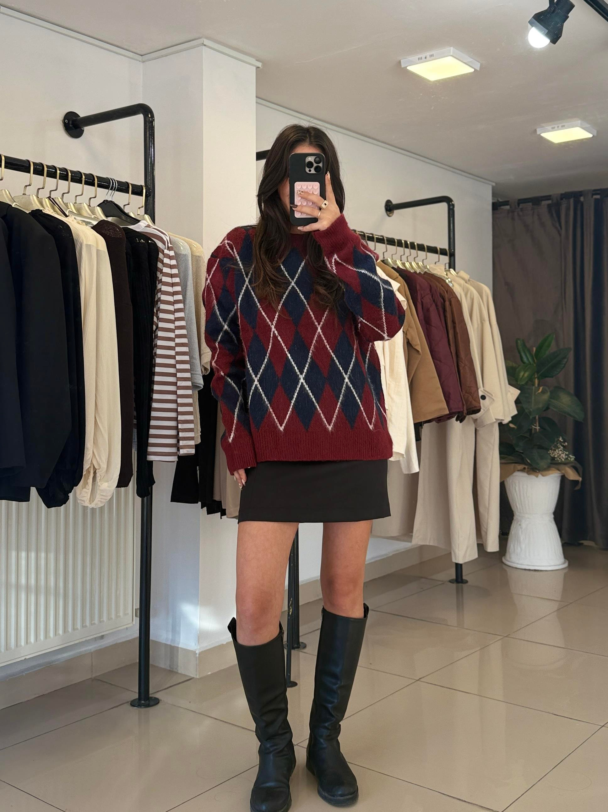 LACİVERT BORDO BAKLAVA DESENLİ KAZAK
