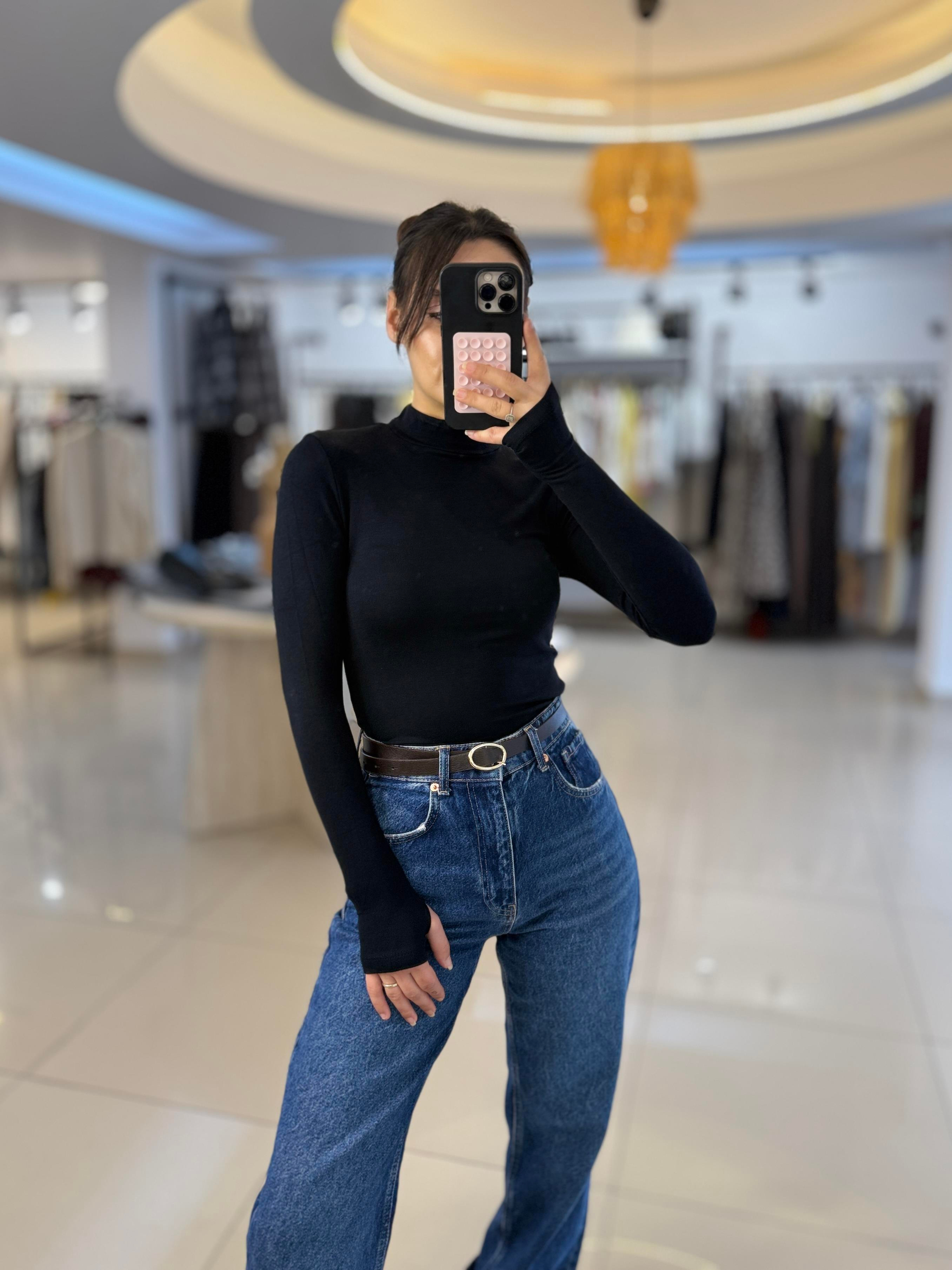 SİYAH DİK YAKA PARMAK GEÇMELİ BLUZ