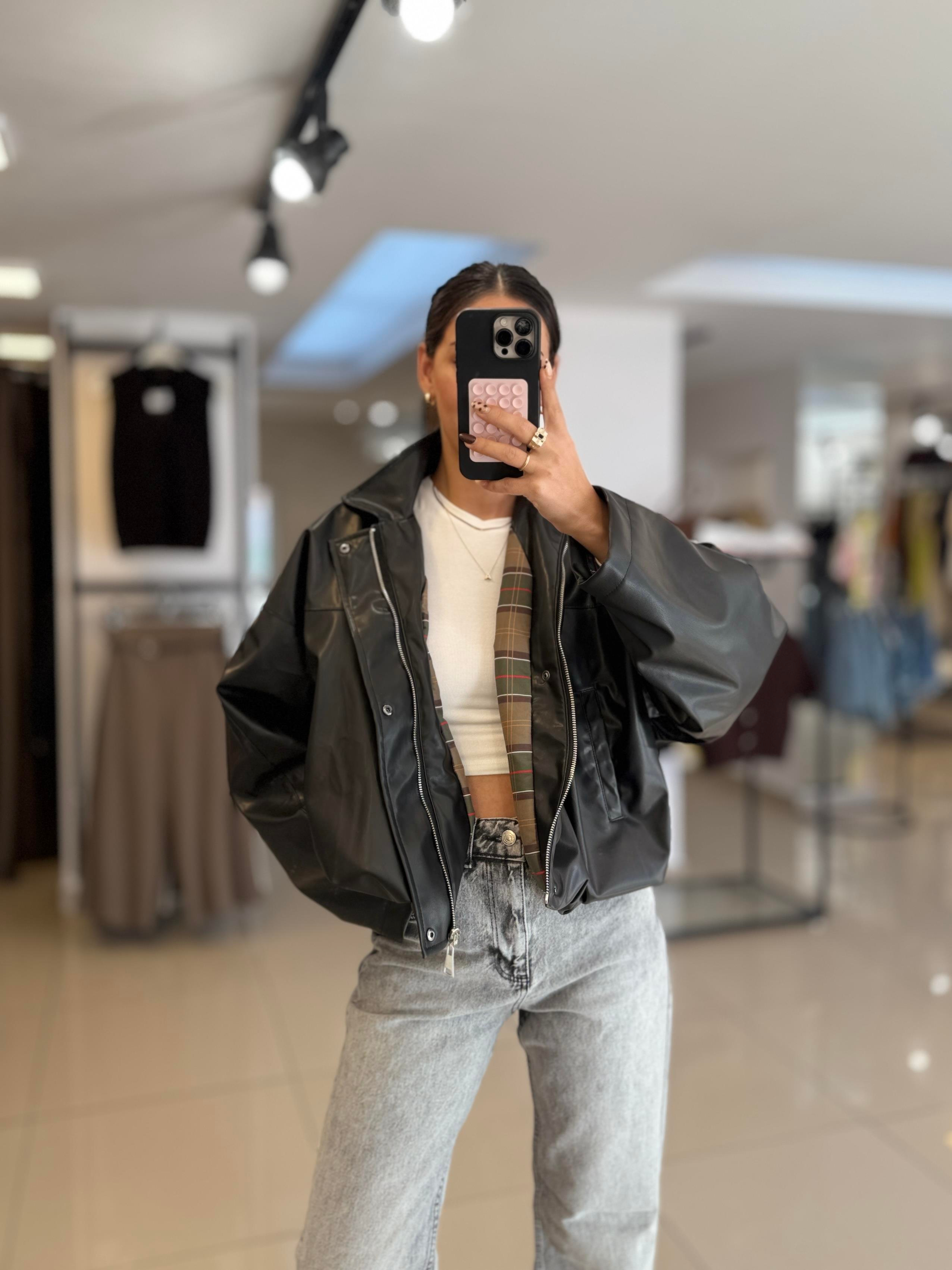SİYAH İÇİ EKOSE ASTARLI BOMBER DERİ CEKET