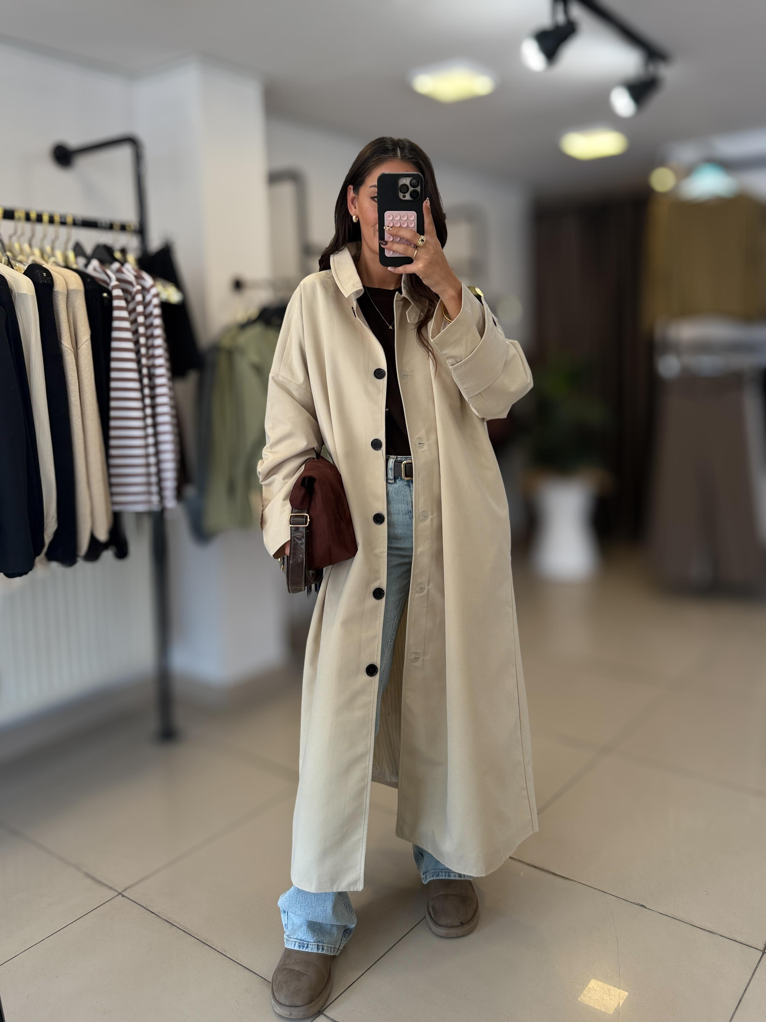 TAŞ RENGİ DÜĞME DETAYLI PREMIUM UZUN TRENÇKOT